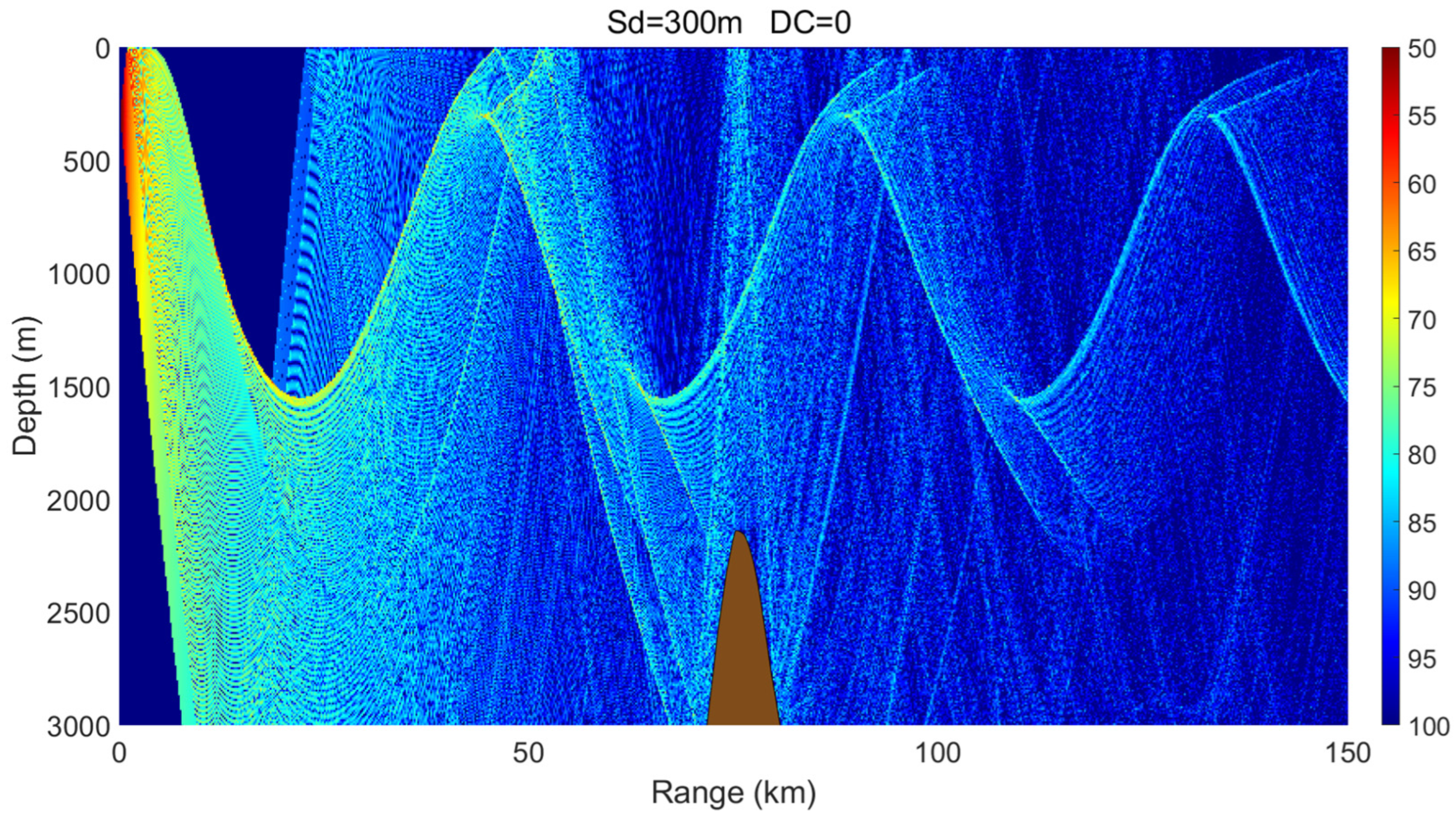 - A cold-core eddy behaves as an upward-focusing acoustic lens, refracting sound rays upward and concentrating acoustic energy in the upper ocean, which makes propagation relatively insensitive to seabed topography. In contrast, a warm-core eddy acts as a downward-focusing acoustic lens, enhancing downward refraction and increasing acoustic interaction with the seabed. As a result, its propagation characteristics are strongly modulated by seabed variations, exciting complex phenomena such as surface ducts, dual-channel propagation, or significant acoustic loss in different topographic settings.
