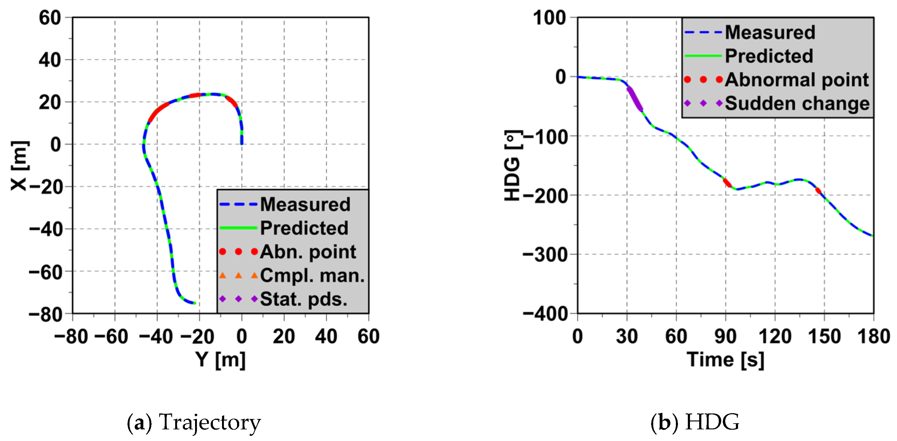- Track continuity issues: In this study, sea trial data were collected from onboard navigation sensors, which usually provide continuous tracking. However, if there are frequent gaps or missing data, it may mean that the equipment failed or someone has turned off the system on purpose. These tracking problems make it hard to monitor behavior accurately and could signal rule violations or suspicious activity.