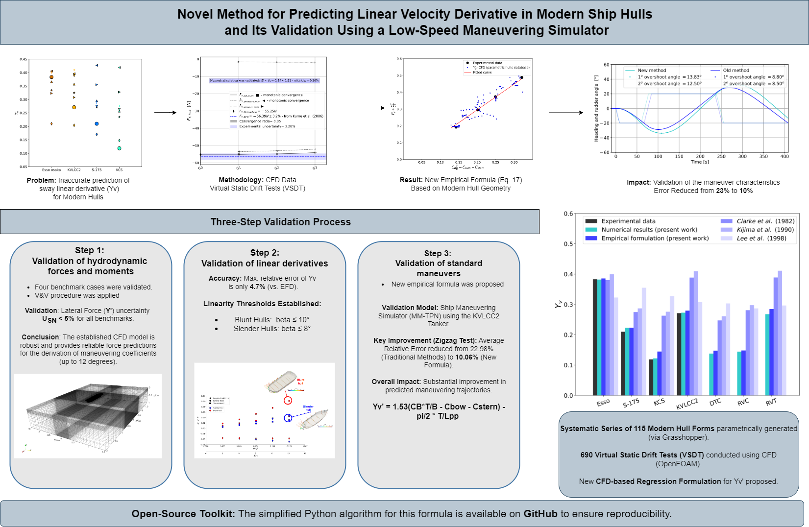 over time directly accounts for the poor performance observed in the KVLCC2 and KCS benchmark cases. Consequently, incorporating these specific geometric trends is recommended when developing empirical models to predict the linear sway derivative. Neglecting these trends may lead to inaccurate estimates of sway force and, consequently, unreliable predictions of maneuverability.