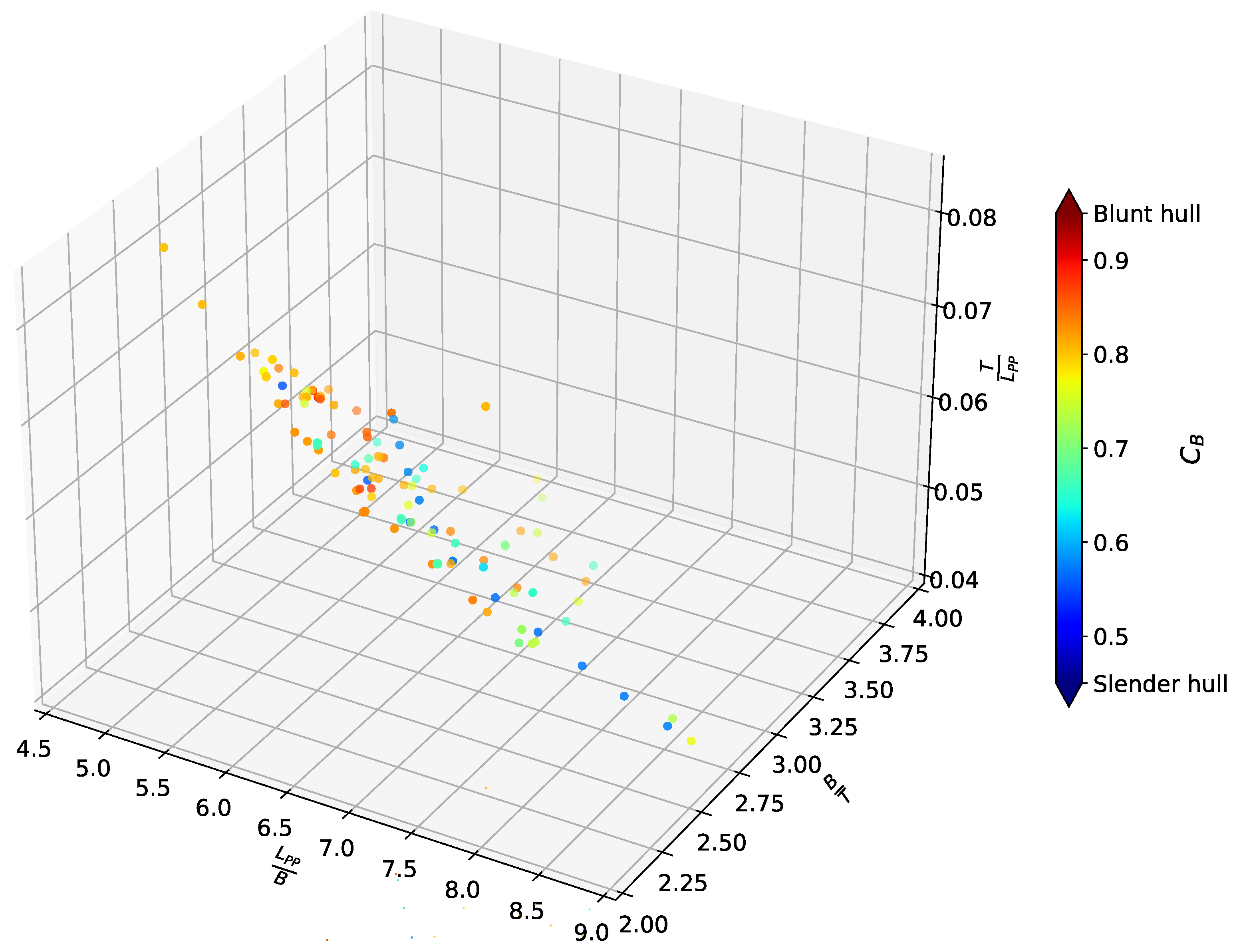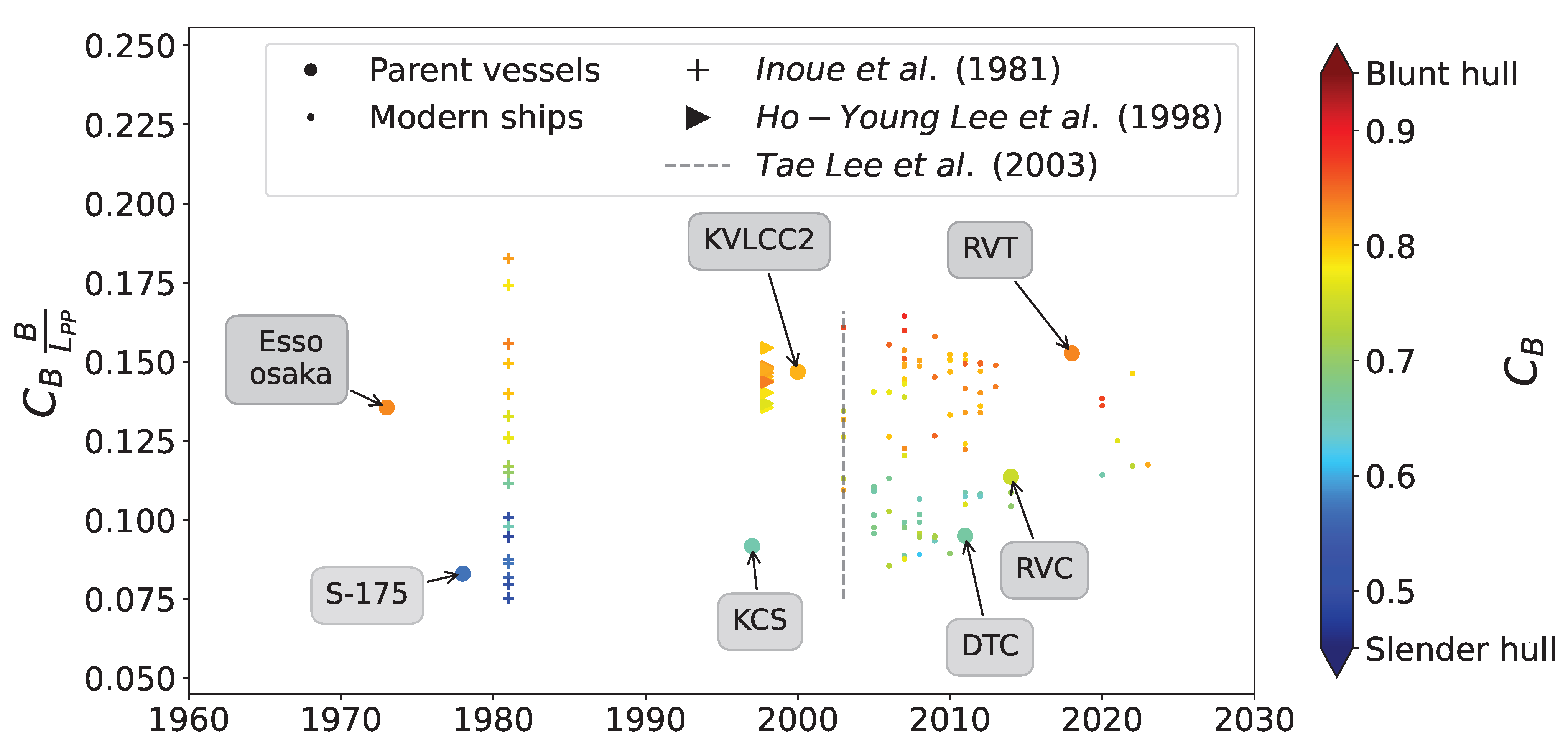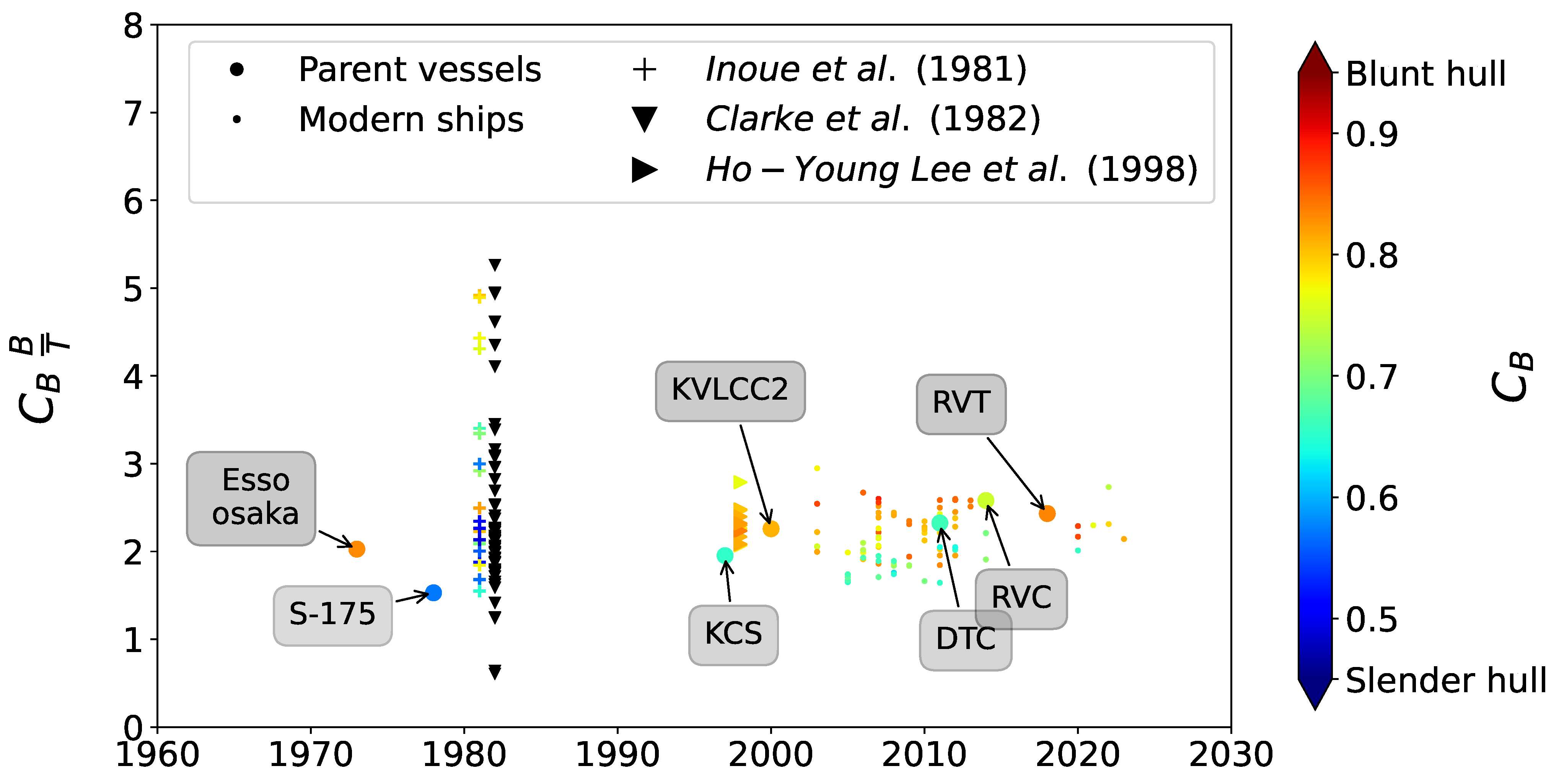 19] shows an increase in the block coefficient in modern vessels; as a consequence, a lack of representation of slender hull forms is expected, consistent with the finding previously discussed.