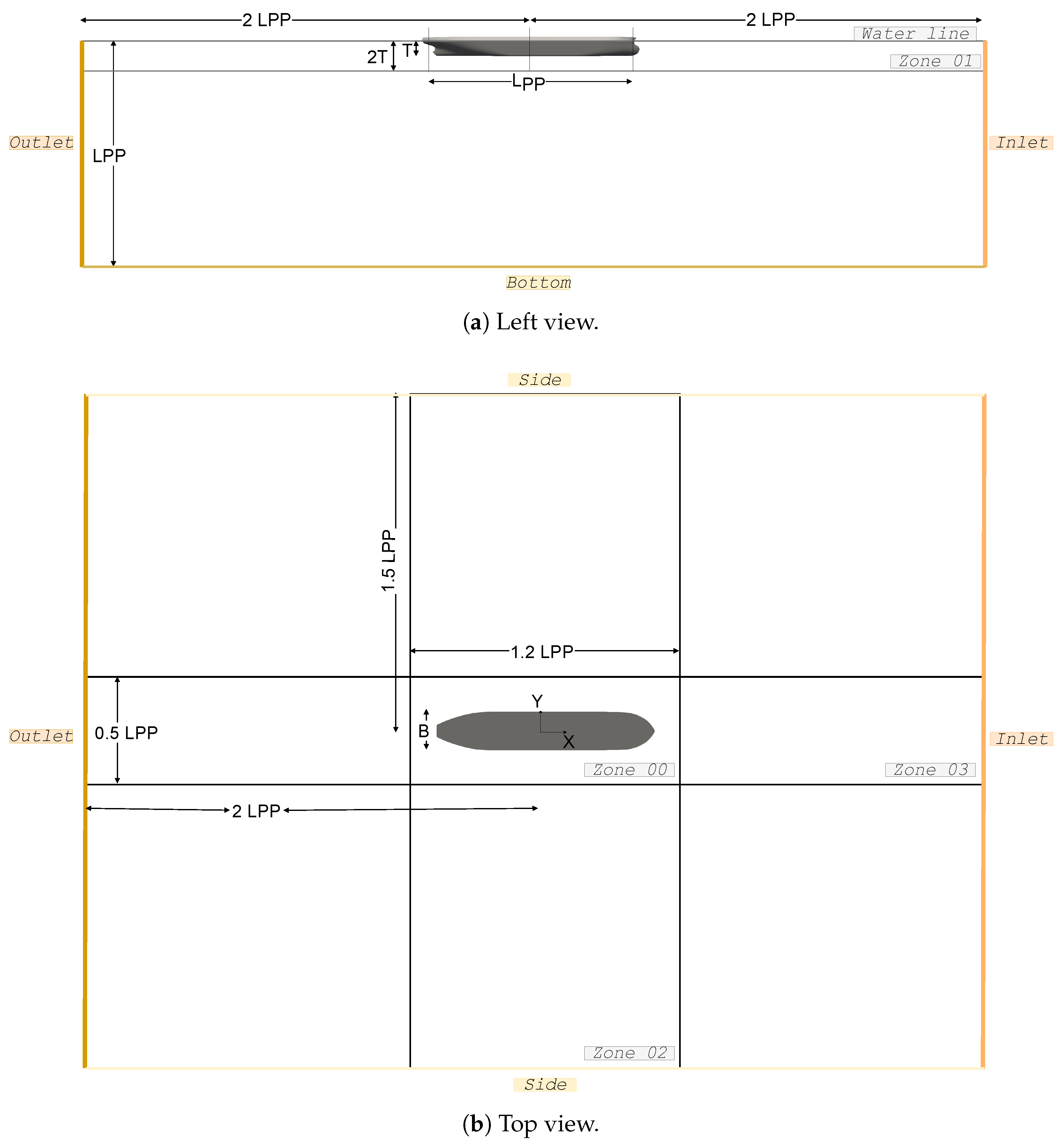 41] numerically examines the effects of bulbous bows on the hydrodynamic forces acting on a tanker-shaped hull by conducting virtual static drift tests and compares the maneuverability of three bow-variant ships. Among the hulls tested, the one with a protruding bow experiences the lowest linear sway velocity derivative, whereas those with a shrink bow experience larger lateral forces. Most previously introduced empirical formulations were derived from experimental results based on a database of hulls with shrink bulbous bows, and there is a need for a deeper understanding of how this apparatus will affect maneuvering performance. Ref. [