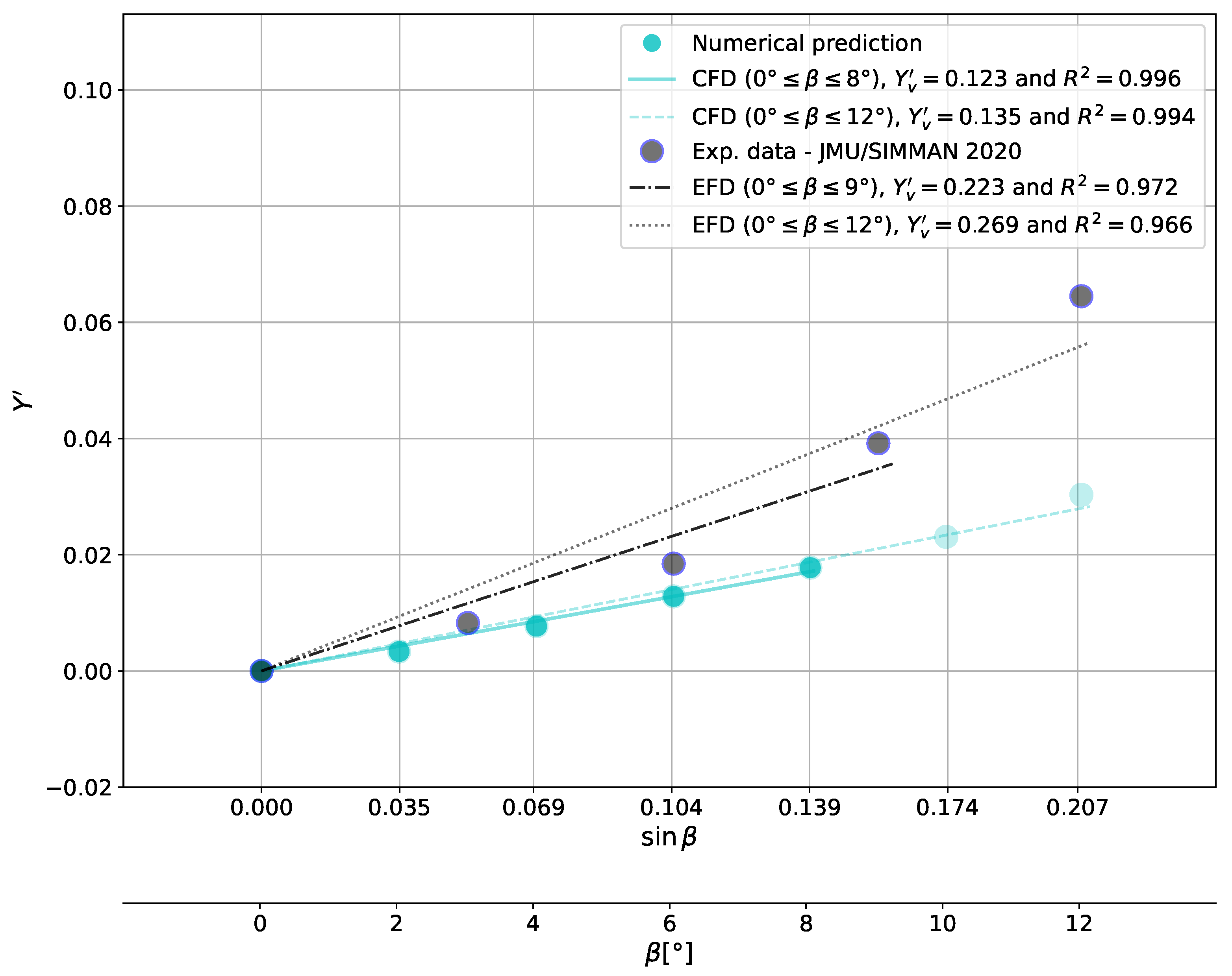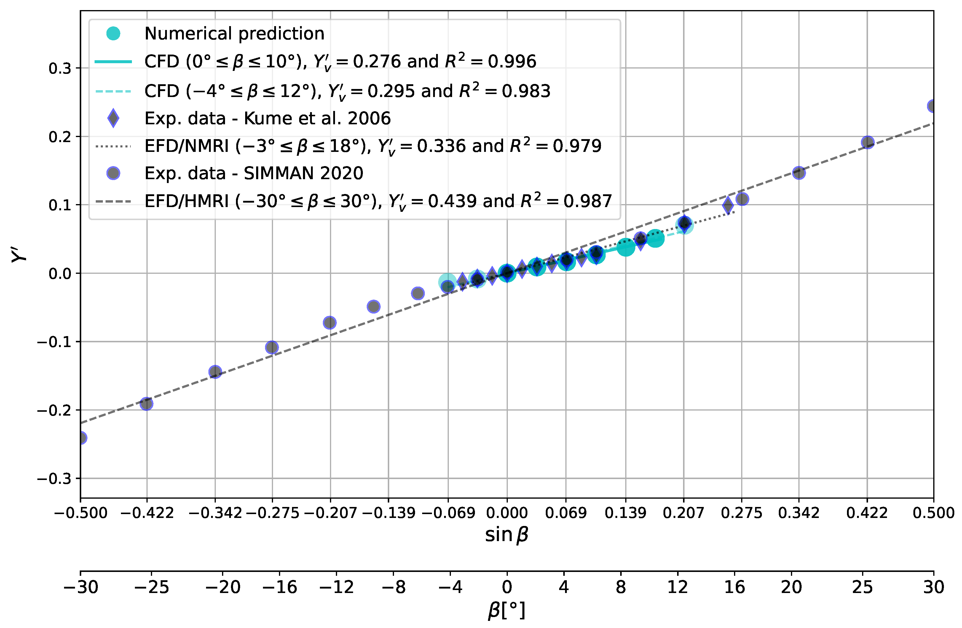 overestimated for the KCS. A comparable analysis was conducted for the linear yaw derivative. For a comprehensive examination of this subject, please refer to the detailed analysis presented by Chame [