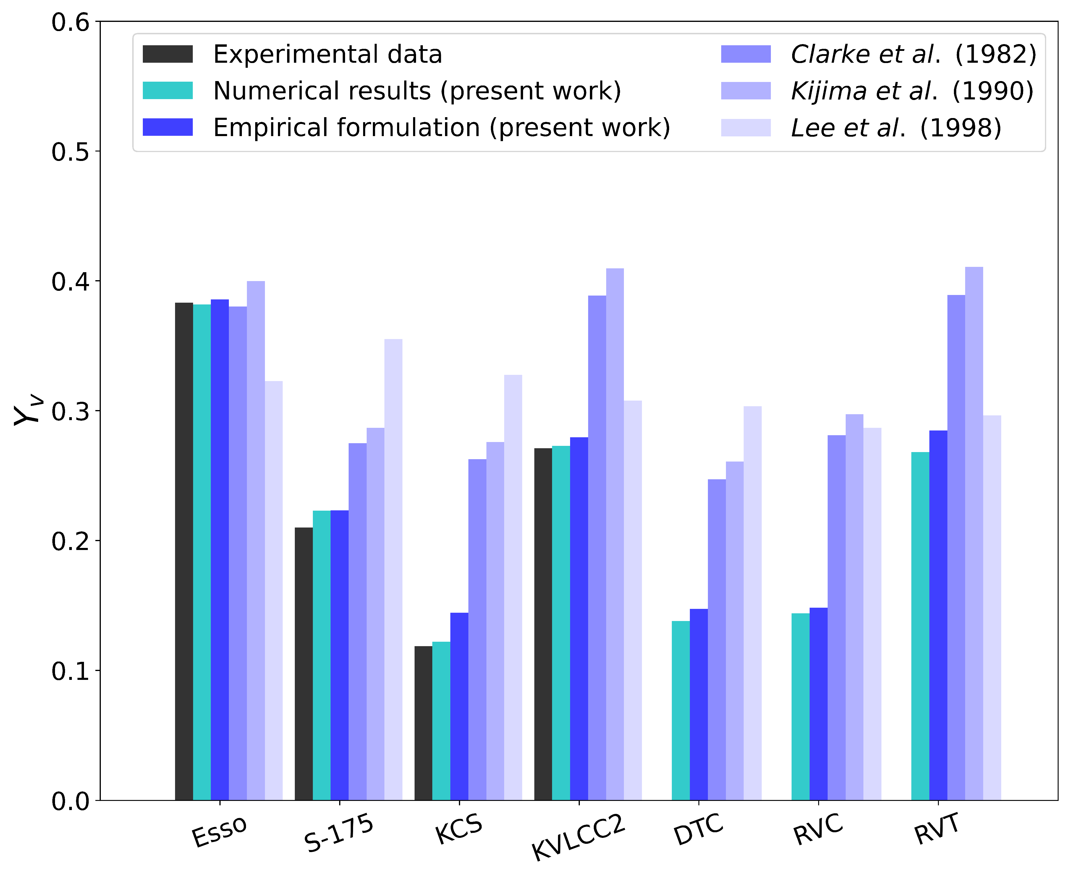 Table 1. Ho-Young Lee’s regression provided a better estimation of the lateral force for the modern box-shaped hull (KVLCC2), while Clarke’s method proved more effective for the Esso Osaka tanker. In contrast, the results for hulls with streamlined curves, such as the S-175 and KCS, were found to be overestimated. It is important to note that the analytical approach produced results that were closest to the experimental measurements. As for ship hulls characterized by a high block coefficient, the results were overestimated by as much as