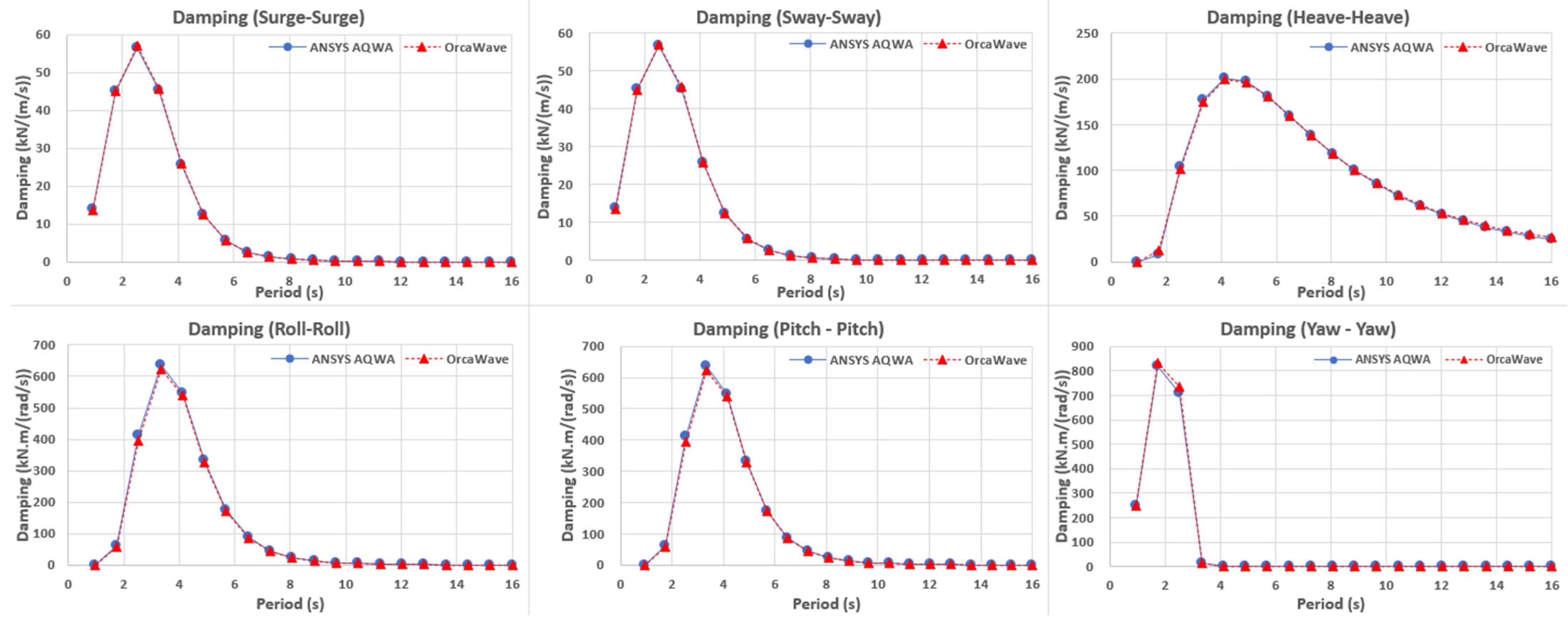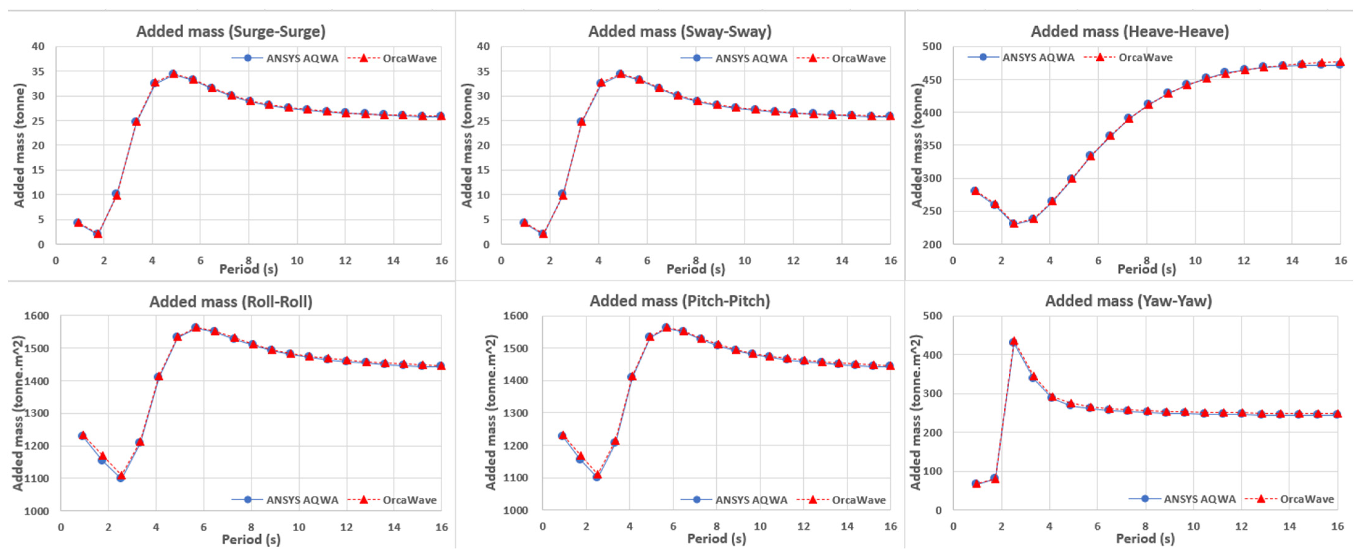 Figure 5. The six-degree-of-freedom added mass/moment of inertia calculated under 0 deg incidence conditions were nearly identical in shape and magnitude across the entire periodic range between the two solvers (AQWA and OrcaWave). Surge and sway exhibited typical behavior, with equivalent short-period values, a gentle plateau around 4~5 (s), and then a very gradual decrease in the longer-period range. Heave increased monotonically with increasing period and tended to converge at the long-period limit. Roll and pitch peaked at