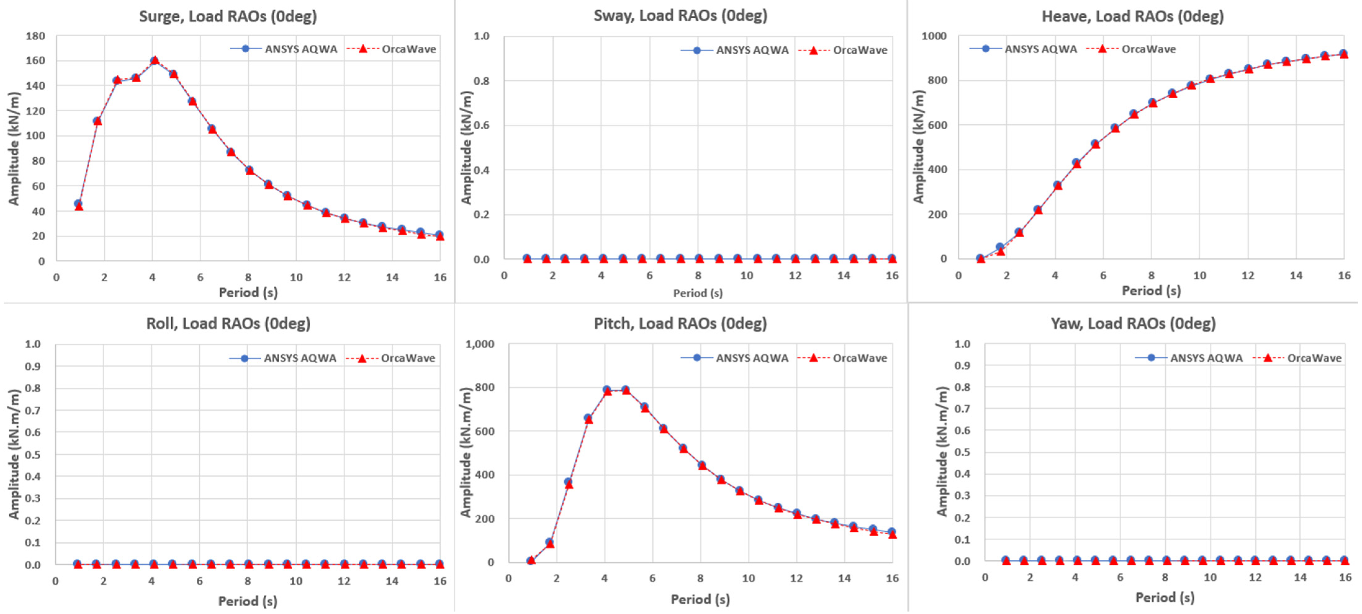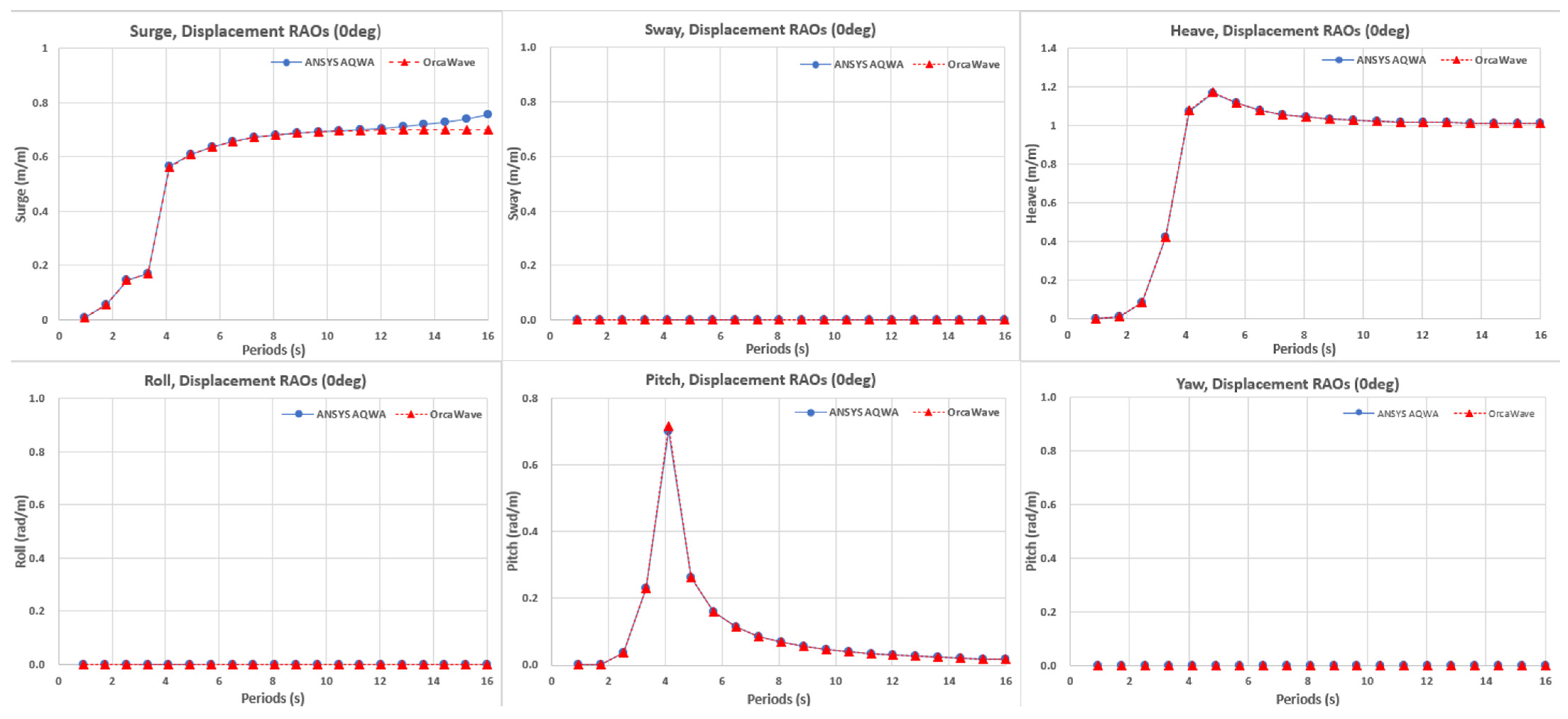 , while AQWA showed only a slight additional increase in long periods. Sway, roll, and yaw remained near zero due to the symmetry of frontal incidence. Heave peaked around