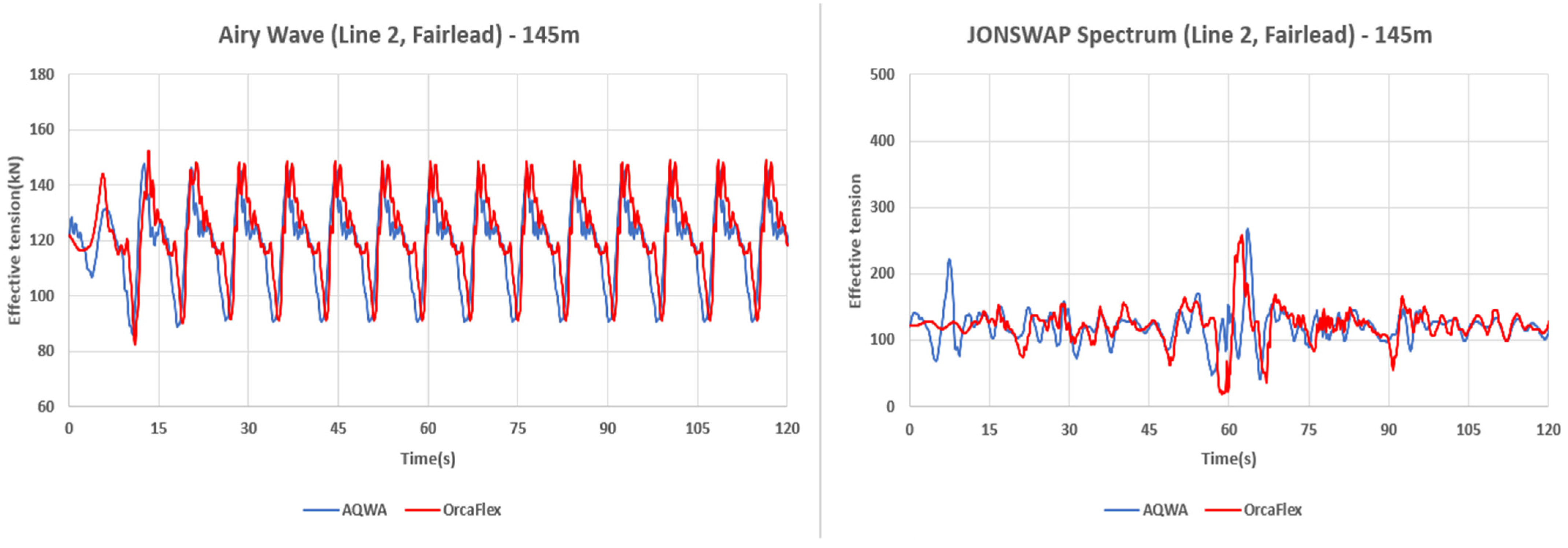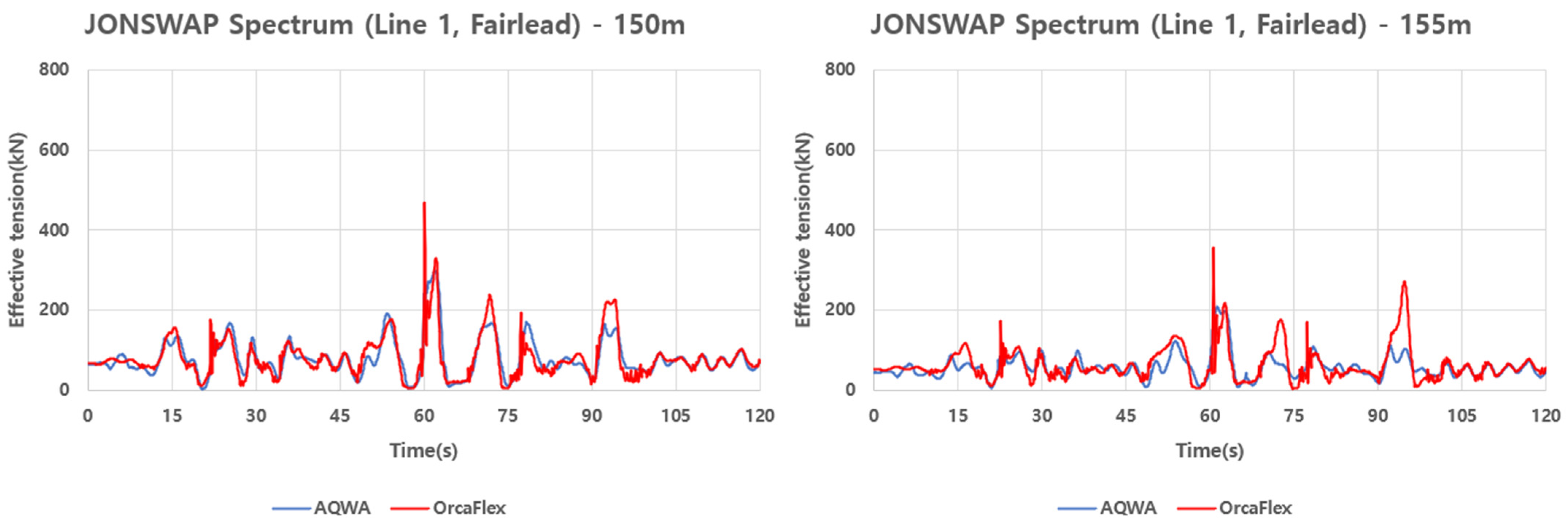 Furthermore, fairlead mooring tensions of Line 1 and 2 time series under JONSWAP conditions are shown in