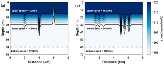 Schematic diagram of the sound velocity distribution under the influence of an ISW; the thermocline displacement geometries are plotted as solid black lines, and the boundaries of the bottom are plotted as dotted black lines: (a) Soliton wave; and (b) packet wave.