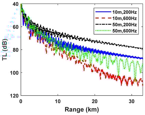 Figure 2 shows the TL plotted under the source conditions of situations 1–4, as shown in Table 1. The source is located at Rs = 0 m, and the receiver is located at Rr = 33 km and at depth Dr = 40 m (lower mixed layer). A LADS set at range Ri = 2.4 km is shown in Figure 1a (Ri = 4 km). The results show that the TL decreases as the depth of the source increases with the same source frequency: the TLs at 200 Hz and 600 Hz decrease by 7.5 dB and 8.3 dB, respectively, when the source depth shifts from the upper mixed layer to the lower mixed layer. This is because the source mainly excites the higher-order modes when the source is located in the upper mixed layer, and the loss of the higher-order modes in the process of propagation is faster. In contrast, the source mainly excites the lower-order modes when it is located in the lower mixed layer; thus, the loss of the lower-order modes is slower, and they are less affected by the thermocline or the ISW.