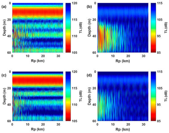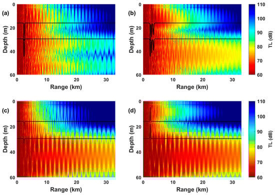 Figure 7 shows that the variations in the ISW amplitude primarily affect the TL with depth. In an environment with a small-amplitude ISW, the energy is concentrated mainly in the upper mixed layer, whereas in an environment with a large-amplitude ISW, the energy propagates mainly towards the lower mixed layer. This result is consistent with the aforementioned conclusion that the increase in the amplitude of the ISW averages the acoustic energy distribution in the vertical direction. A comparison of Figure 7a,c reveals that when the polarity of the ISW changes from a depressed one to an elevated one, the energy transfers from the lower mixed layer to the upper mixed layer, resulting in a decrease of approximately 1 dB in the upper mixed layer and an increase of approximately 2 dB in the lower mixed layer. Comparing Figure 7b,d, the energy decreases by approximately 2 dB throughout the entire depth range when the polarity of the ISW changes from depressed to elevated.