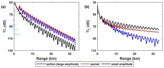Comparison of the effects of different numbers and amplitudes of ISWs on the TL with distance variations when the source frequency is 600 Hz and Ds = 50 m: (a) Receiver at a depth of 12 m and (b) receiver at a depth of 40 m.