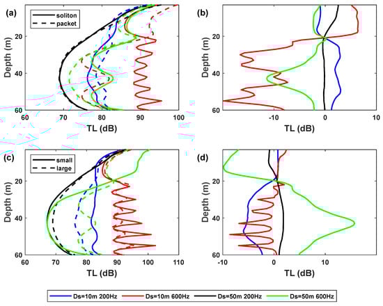 Figure 5c,d show that when the amplitude of the ISW increases, the impact of the ISW amplitude on the TL is mainly exerted at the lower mixed layer under different source conditions. Additionally, at the upper mixed layer, when the ISW amplitude increases, the source conditions at deep and high frequencies (Ds = 50 m, 600 Hz) decrease significantly, with an average decrease of 8.6 dB in the TL. Figure 5d shows that when the ISW amplitude increases, the source conditions at shallow and low frequencies (Ds = 10 m, 200 Hz) have an average decrease of 5 dB in the TL; the source conditions at shallow and high frequencies (Ds = 10 m, 600 Hz) fluctuate more severely with an increasing depth, with an average decrease of 2 dB and a maximum reduction of 9 dB at a depth of 49 m; and the source conditions at deep and high frequencies (Ds = 50 m, 600 Hz) have a maximum increase of 16 dB at a depth of 43 m and a maximum reduction of 10 dB at a depth of 13 m.