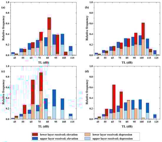 In Figure 6, the TL received at the lower mixed layer (red bar; Dr = 40 m) is less than the TL received at the upper mixed layer (blue bar; Dr = 12 m). This phenomenon is clearly observed when the source depth is 50 m. Additionally, the range of the TL is wider when the frequency of the source is 600 Hz. This result shows that the impact of the source frequency on the TL is consistent with previous findings that showed that the TL increases when the source frequency increases. A comparison of Figure 6 reveals that the TL received at the lower mixed layer obviously changes when the ISW polarity changes from depressed (light-coloured bar) to elevated (dark-coloured bar). In the environment of an elevated ISW, when the TL is received at the lower mixed layer, the probabilities of the TL dominating within intervals of 95 dB, 105 dB, 65 dB and 65 dB, as shown in Figure 6, respectively. For example, in the lower mixed layer, the relative frequency of the TL within an interval of 65 dB in an elevated ISW environment is five times greater than that in a depressed ISW environment, as shown in Figure 6d. Therefore, the ISW polarity influences the TL received at the lower mixed layer, especially when the source is located in the lower mixed layer where the elevated ISW decreases the TL.