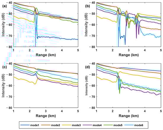 As shown in Figure 8a, in the LADS environment, the intensity of mode 1 experiences a significant loss, with a maximum fluctuation of approximately 28 dB; the energy of mode 1 mainly transfers to mode 6, which experiences an increase in sound intensity by approximately 2 dB. The energy is transferred mainly from lower-order modes to higher-order modes. Figure 8b shows normal modes in the LADP environment, where the coupling phenomenon between modes is enhanced. After encountering the ISW, the dominant modes in terms of energy are mode 1 and mode 3, and mode 6 has the greatest reduction. This indicates that under the impact of the packet, the energy of the higher-order modes transfers to the lower modes. Figure 8c shows that the fluctuation in intensity for each normal mode is relatively small in the small-amplitude ISW environment, which is consistent with the previous study [28]. The dominant mode almost remains, and the maximum fluctuations of the other coupled modes do not exceed 6 dB. In Figure 8d, after being affected by the elevated soliton, the dominant mode changes from mode 2 to mode 1, and the energy is coupled mainly between modes 3 and 6.