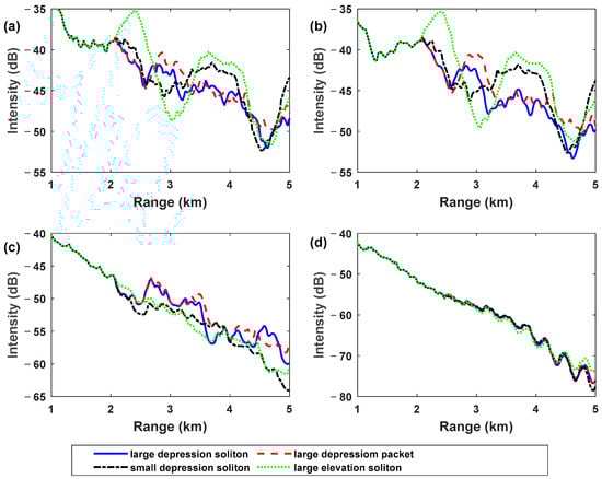 Considering the impact of the ISW on higher-order modes, the grouping of modes on the basis of Equation (12) is shown in Figure 9. Figure 9a shows the intensity of all the modes and presents the maximum fluctuation in the large-elevation soliton environment and the minimum fluctuation in the LADS environment, which correspond to the influences of the ISW polarity and ISW amplitude variations on the TL, as previously mentioned. It can be observed that the intensity of modes 1–8 is almost equal to the total modal intensity, and modes 16–26 are almost unaffected by the variations in the ISW characteristics. Additionally, the intensity of modes 9–15 decreases slowly in the large-amplitude and depressed ISW environments, as shown in Figure 9c.