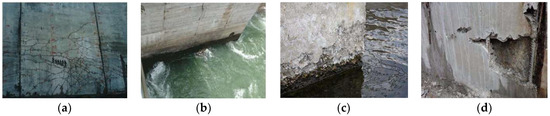 The common defects observed in the dam bodies of hydropower stations include (a) cracks, (b) water leakage, (c) surface erosion, and (d) tendon leakage.