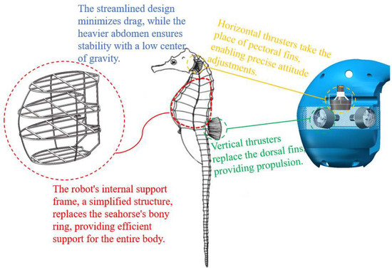 The preliminary design concept is illustrated in Figure 3 [27]. The high metacentric design ensures that the underwater vehicle maintains a predominantly vertical posture, mimicking the upright movement of a seahorse to enhance maneuverability and facilitate navigation through complex underwater environments. Horizontal and vertical propulsion devices replicate the seahorse’s dorsal fin vibrations and pectoral fin steering, providing thrust and enabling precise attitude adjustments. The rigid bony rings of the seahorse, which protect their internal organs and minimize drag, inspire the vehicle’s structural design. The internal configuration features a simplified support frame that stabilizes the entire body while accommodating equipment, ensuring ease of integration and transport.