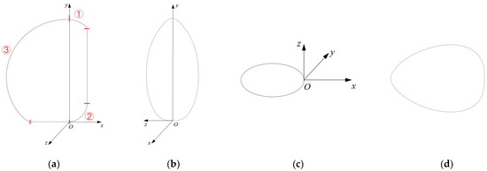 Standard rectangular coordinate system for streamline configuration: (a) frontal view, (b) side view, (c) elevation view, and (d) semi-elevation horizontal profile curve.