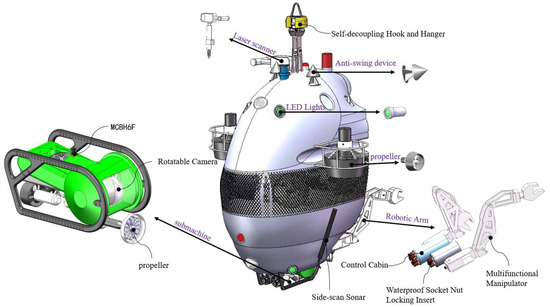 To handle various dam surfaces, the vehicle is equipped with optical imaging equipment, supported by a light-emitting diode (LED), and various acoustic devices. Communication equipment is installed on top to minimize interference. The vehicle arms are placed on each side of the optical equipment within the operational range, keeping the height as low as possible. Side-scan sonar units are mounted on either side of the vehicle. A sub-unit, located at the bottom for easy detachment and recovery, connects to the main vehicle via an umbilical cable, with the main unit having a small winch control. Emergency self-rescue equipment includes a jettison mechanism and buoys.