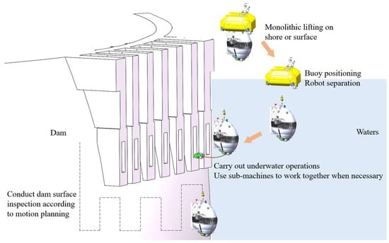 The vehicle operation process consists of deployment, diving, dam surface inspection, dredging, and recovery. As shown in Figure 6, the power buoy and vehicle are initially deployed together. After disconnecting from the buoy, the vehicle descends to the target dam surface and begins the planned inspection route. If certain areas are inaccessible, the sub-unit is deployed for further investigation. In cases of sediment buildup, the vehicle performs dredging to clear the silt. Finally, the vehicle collaborates with the propulsion system and umbilical cable for recovery.
