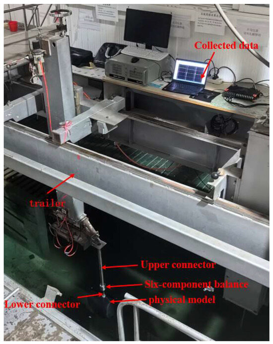 Three trailing tests, each lasting over 30 s, were conducted for two conditions, namely forward at 0.76 m/s and lateral at 0.51 m/s, with the average value taken for each. To account for the impact of the dead weight of the upper and lower connectors and the six-component balance on the results, a no-load test was first performed using only these two components. The final physical model test results were obtained by subtracting the no-load values from the measurements under the two working conditions.