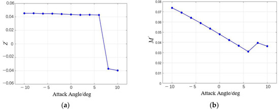 The variation in the lift coefficient and pitching moment coefficient with the angle of attack: (a) the variation in the lift coefficient with the angle of attack; (b) the variation in the pitching moment coefficient with the angle of attack.