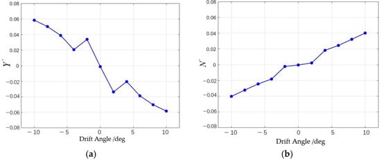 Similarly, the lateral force coefficient and yaw moment coefficient for varying drift angles were dimensionless, with the final results shown in Figure 13. The vehicle’s lateral force coefficient exhibits instability between −2° and 2°, but overall, the relationship is approximately linear. Linear fitting of the data gives position derivatives of and .