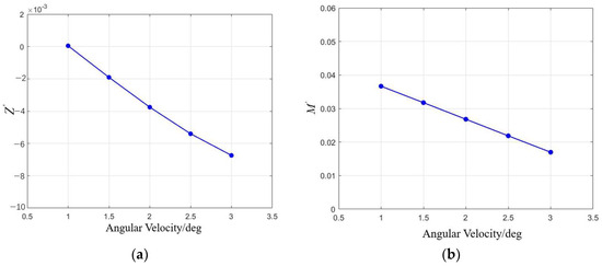 The variation in the lift coefficient and pitching moment coefficient with pitch angular velocity: (a) the variation in the lift coefficient with pitch angular velocity; (b) the variation in the pitching moment coefficient with pitch angular velocity.