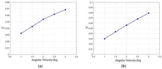 The changes in the longitudinal angular velocity and turning angle of the hydrodynamic center impact the course stability of the underwater vehicle in both the vertical and horizontal planes. To evaluate this, the hydrodynamic derivatives , , , and must be calculated. The angular velocity was varied within the interval [1 deg/s, 3 deg/s] in steps of 0.5 deg/s, and the pitching and rotational motion performance was simulated using the rotating coordinate system method, as shown in Figure 14.