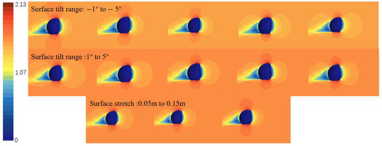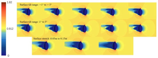 The deformation configurations of 0.20 m and 0.25 m do not satisfy the optimization constraints and are therefore excluded. To investigate the hydrodynamic behavior of the vehicle under forward three-knot and lateral two-knot inflows, velocity contour plots for various deformation configurations were generated through steady-state simulations. The results are presented in Figure 21, Figure 22, Figure 23 and Figure 24.
