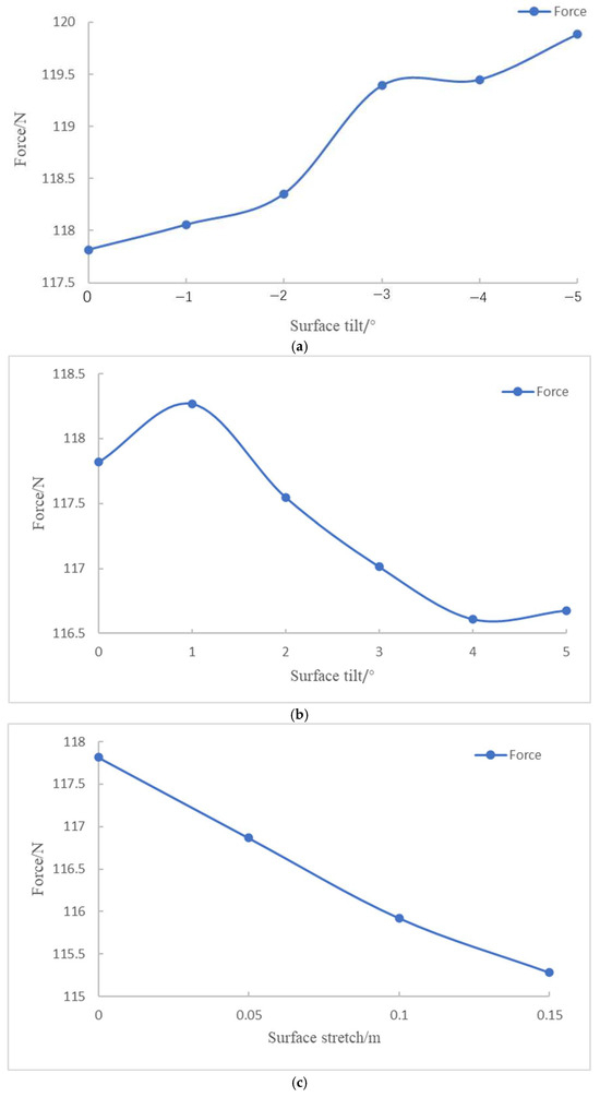 Variation in resistance under forward 3-knot flow: (a) surface tilt range of −1° to −5°; (b) surface tilt range of 1° to 5°; (c) surface stretch of 0.05 m to 0.15 m.