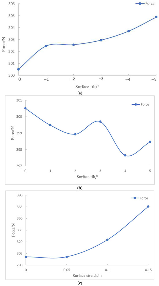 - Control points along the vehicle’s working face in the x-direction were selected, and their longitudinal tilt angle was adjusted within a range of [−5°, 5°], with a step size of 1°.