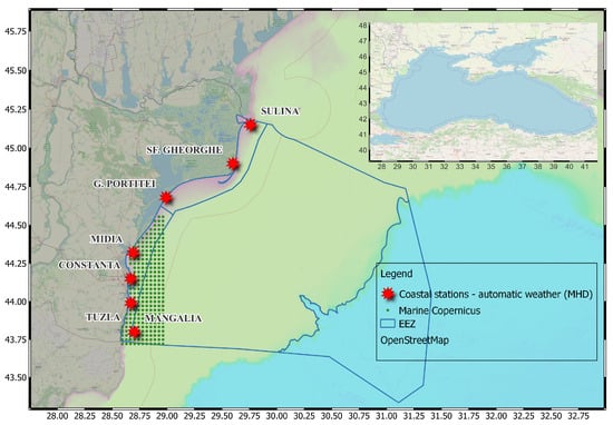 Spatial distribution of data sources along the Western Black Sea coast. illustrates the spatial distribution of data sources along the Western Black Sea coast, including in-situ coastal stations and the coverage of the Copernicus Marine Service data. The red stars indicate the locations of coastal automatic weather stations, while the green dots represent the Copernicus Marine Service data coverage. The blue line demarcates the Romanian coastal waters as the Economic Exclusive Zone (EEZ). The marine waters are classified into four distinct water bodies based on the Marine Strategy Framework Directive (MSFD) [,]: Waters with variable salinity in the north influenced by the Danube River (BLK_RO_RG_TT03), Coastal waters from the central to the south (BLK_RO_RG_CT), Marine Waters from the 30 m isobath to 200 m (BLK_RO_RG_MT01), and Offshore Waters with depths of at least 200m (BLK_RO_RG_MT02) [].