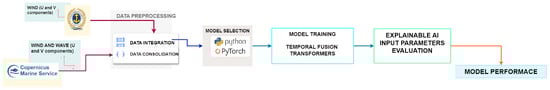 The workflow illustrated in Figure 2 integrates both in-situ data from coastal stations [] and modelled data from the CMEMS []. The initial stage involves data preprocessing, where raw in-situ data, including wind and wave parameters, undergoes cleaning, formatting, and feature systematization. This step ensures data quality and consistency. Concurrently, relevant model outputs, such as wave forecasts, are acquired from the CMEMS. Next, data integration and consolidation occur. In-situ observations are spatially and temporally matched with CMEMS, followed by data fusion techniques to create a unified dataset. This consolidated dataset forms the foundation for subsequent model development.