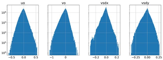 The y component (vsdy—the last column in Figure 5) shows a higher dependency upon the longitude (approx. 48%) and its previous values (approx. 68%). The decoder variables show a dependence on vo (approx. 52% than uo—approx. 48%).
