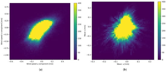 In Figure 4a,b, the highest concentration of wave component data points is clustered around the origin (0, 0), indicating a predominance of low magnitudes. The distribution exhibits an elliptical shape, suggesting a potential correlation between the U and V components. This elongation along the diagonal implies a tendency for both components to have the same sign, expressing a consistent wave direction. Comparing the two figures reveals similarities in the overall shape and concentration of data points around the origin. However, the wind speed distribution in Figure 4a appears more dispersed than the wave component distribution in Figure 4b. This suggests that wind speeds exhibit a wider range of magnitudes and directions compared to the wave components. These visualizations provide valuable insights into the interrelationships between wave and wind data’s U and V components, highlighting their typical magnitudes and directional tendencies. Further analysis, such as calculating correlation coefficients or fitting multivariate distributions, could quantify these relationships and better characterise both wind and wave dynamics.