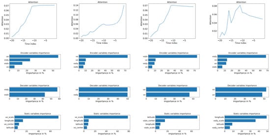 For the second wind component vo from Figure 5 (second column from left to right), it seems that this is the most dominant component of the Black Sea system as its major dependencies are related to its own scale (Static variables) and previous values (encoder variables). At the same time, the decoder shows 50/50 dependence between the y component of the wave (vsdy) and the orthogonal value for wind (uo). The attention plot also suggests that the model focuses more on closer previous values than the other analyzed components that focus on more than the most recent values for the same component.