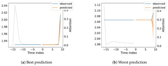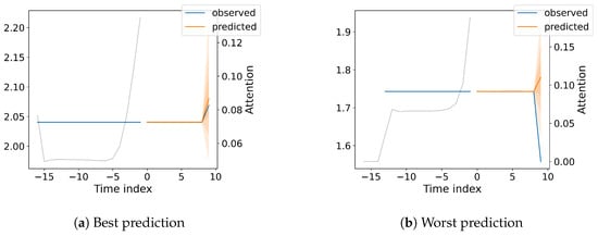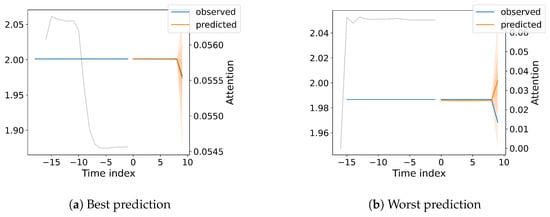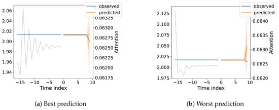 Figure 9a shows a distinct peak in attention around −14 time steps in the past, indicating that this particular historical data point is highly influential in predicting the current value. In contrast, Figure 9b shows a more gradual decline in attention weights, with a slight peak around −15 time steps and a more pronounced peak towards the very recent past (hindcast). The observed values in Figure 9a exhibit a relatively stable pattern, while Figure 9b shows a slight upward trend with a steeper increase towards the end. This difference in data dynamics highlights the model’s ability to adapt its attention mechanism to capture various temporal patterns, including scenarios where long-term dependencies play a significant role.