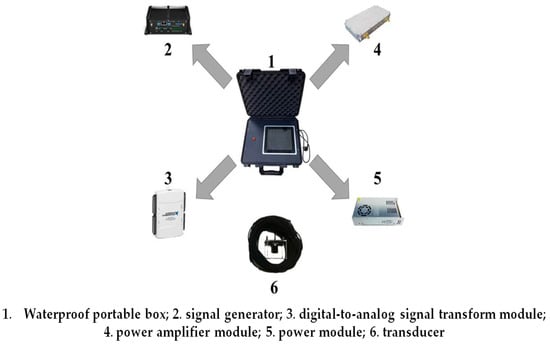 The ADD is as reported by Fu et al. [] and includes a high-capacity lithium battery power module (LRS-75-12, MeanWell Enterprises Co., Ltd., Taiwan, China) providing power to the entire system, a signal generator, a digital-to-analog signal transform module, a power-amplifier module, and a transducer (Figure 3). Signal generation was completed by feeding LabView (Version 2017, National Instruments, Austin, TX, USA)-based codes into the system to generate the source signal on demand, which was further transformed into an analog signal through a digital-to-analog signal transform module (DAQ Card USB-6216, National Instruments, Austin, TX, USA) at a sampling rate of 400 kS/s. The output was then fed into the customized power amplifier module (ATA-M112, Aigtek Co., Ltd., Xi’an, China) to boost the signal energy, reaching 120 W. The signal was transmitted into the water through a non-directional underwater transducer (WBT 30, China Shipbuilding Industry Group Co., Ltd., Hangzhou, China) with a centroid frequency of 30 kHz.