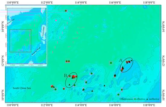 FV “Yuedian 42212” ADD trial stations in South China Sea, showing effective and ineffective deterrence trials conducted in 2022. ●: effective deterrent trials; ▲: ineffective deterrent trials. A and B represent two areas with poor deterring effects. □ represents the study area.