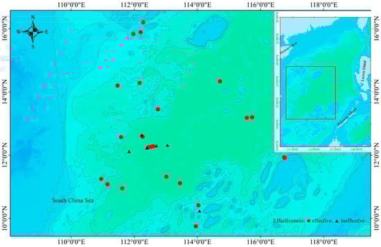 FV “Yuedian 42212” ADD trial stations in South China Sea, showing effective and ineffective deterrence trials conducted in 2023. ●: effective deterrent trials; ▲: ineffective deterrent trials. □ represents the study area.
