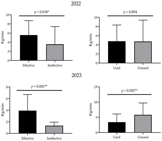 In 2023, the vessel used 712 fishing nets, with a total catch of 261,031 kg and an average CPUE of 5.03 ± 3.67 kg/min. On the nights when dolphins appeared, 51,772 kg of squid was caught, with an average CPUE of 3.41 ± 2.63 kg/min. On the nights when dolphins did not appear, 209,259 kg of squid was caught, with an average CPUE of 5.82 ± 3.84 kg/min. There was a significant difference (p = 0.002, <0.01) between the two conditions (Figure 6). Furthermore, the CPUE of the nights on which deterrence was effective (3.93 ± 2.69 kg/min) differed significantly (p = 0.001, <0.01) from the CPUE of the nights when it was ineffective (1.33 ± 0.55 kg/min) (Figure 6).
