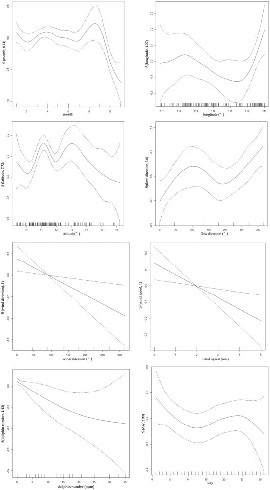 The correlation test results between the CPUE and variables in GAM are shown in Table 1. The variables with p > 0.05 (low correlation) are the longitude, day, and flow velocity. Although the p values of the longitude and day are greater than 0.05, the AIC value of the model that includes them is the smallest. Therefore, the final variables included in the model are the month, flow direction, latitude, wind speed, wind direction, dolphin number, longitude, and day. The explanatory power of these variables on the CPUE variance was 35.7%, with a coefficient of determination for model fitting of 0.271. According to the AIC, the optimal model expression for the GAM is as follows: