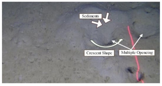 There are hundreds of underwater species in the ocean. Nephrops norvegicus (also known as Norway lobster) is one of the most important commercial species in Europe. This species is distributed from 10 m to 800 m depth in the Atlantic NE waters and the Mediterranean Sea [], where sediment is suitable for them to construct their burrows. This species spends most of its time in muddy seabed sediments on the seabed and leaves behind some burrows with certain characteristics. These burrows are sometimes in groups of two, three, or four and sometimes a single burrow represents the presence of Nephrops. These burrows have certain characteristics like at least one opening has a crescent moon shape and a shallowly descending tunnel, which sometimes forms a delta-like tunnel opening. The opening of burrows has scratches and tracks that make these burrows different from other species. An individual Nephrops is counted by counting the burrows of Nephrops. Figure 2 shows the features of the Nephrops burrow system.