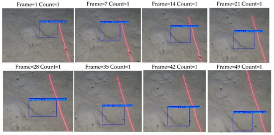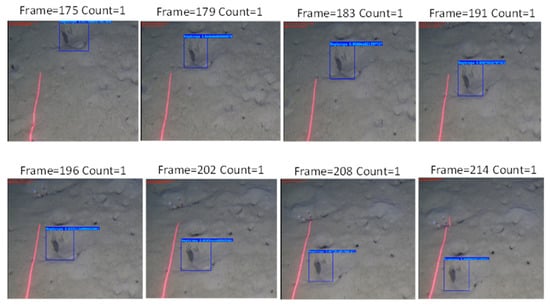 Figure 5 shows the identification, tracking, and counting of a Nephrops burrow in some consecutive frames. These frames are extracted from the ‘RF09_Min1’ temporal segment. The figure shows the detection on frame 1 and the proposed tracking algorithm also starts tracking the burrow. The burrow is detected in the next consecutive frames and the tracking module tracks the burrow based on the spatial and temporal analysis. The figure shows eight different frames from the first 50 frames to show how the tracking algorithm is working and counting the burrow. The burrow counts are not increasing in this case as the same burrow is identified and tracked in each frame. Hence, the proposed work is able to count the number of unique Nephrops burrows in a video frame.