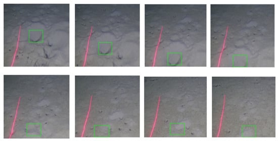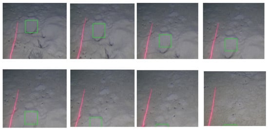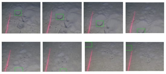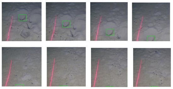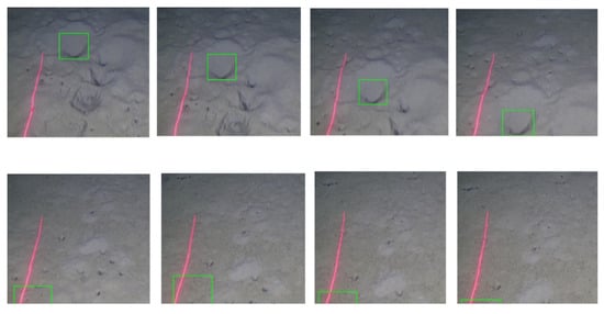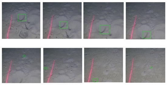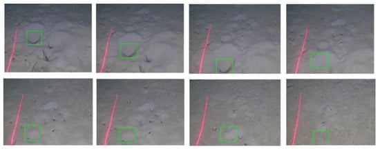 Figure 6 also shows a similar result as discussed in the previous example. These frames are extracted from the ‘RF09_Min3’ temporal segment. The figure shows eight consecutive frames from the input video. The burrow is detected and tracked in each frame until it disappears from the visibility window. In each frame, the burrow is detected with a different confidence value and with a different size. This is the main reason for the failure of a known tracking algorithm. The proposed spatial–temporal tracking algorithm tracks the burrow based on their spatial intersection values. As is clearly seen in the figure, the detected burrow bounding boxes are different in sizes in each frame but the algorithm is able to track them and count them as one burrow.