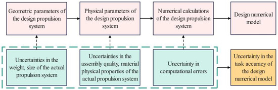 In the actual alignment process, construction personnel initially rely on manual trial-and-error methods based on experience. Due to the lack of scientific theoretical support, this approach cannot ensure alignment accuracy and efficiency. Therefore, numerical calculation methods such as the three-moment method [4,5], transfer matrix method [6], singular function method [7], and finite element method [8] have been proposed. However, due to process errors during actual manufacturing and assembly, as well as material property degradation caused by long-term operation, it is difficult to accurately obtain geometric and physical parameters, leading to parameter uncertainties [9,10]. These uncertainties significantly increase the difficulty of constructing precise numerical models. These sources of uncertainty are illustrated in Figure 1. The lack of a scientific and efficient alignment method results in the alignment process potentially accounting for up to 72% of the propulsion system installation period [11]. The efficiency of alignment directly impacts shipbuilding and repair schedules, subsequently affecting the shipyard’s economic benefits and on-time delivery capability.