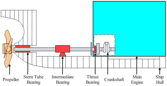 Marine propulsion systems with single stern tube bearing are a common configuration. As shown in Figure 2, the stern tube is supported by a single bearing with no forward stern tube bearing and the intermediate shaft is supported by a single intermediate bearing, while the thrust shaft is located near the flywheel end and welded integrally with the main engine crankshaft. The shafting of this type of propulsion system is characterized by low rigidity and high elasticity, resulting in a minimal impact of hull deformation on bearing loads [15]. Therefore, such propulsion systems are widely used in bulk carriers, LPG carriers, and other types of vessels. A post-incident study of the failure of the Chinese research vessel Snow Dragon indicated that, due to the specific feature of the Snow Dragon shafting being a single stern tube bearing design, there were even more stringent requirements for its alignment calculations, as under the old alignment calculations, the bearing load was highly prone to overloading even in normal ship operations [16]. In summary, this paper takes marine propulsion systems with single stern tube bearing as the research object.