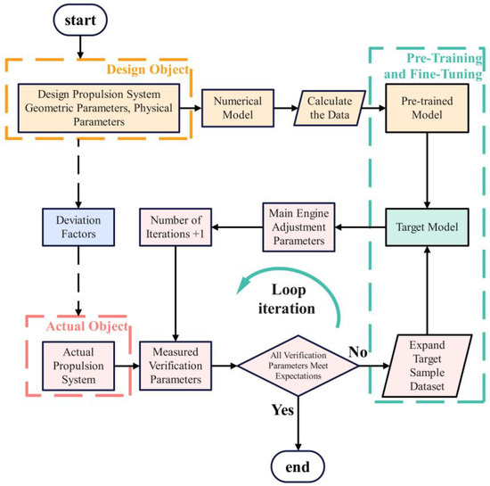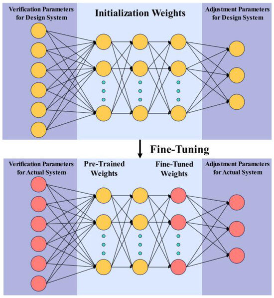 The overall concept is illustrated in Figure 6. First, large-scale samples are obtained through the finite element simulation of the design propulsion system and are used to construct a neural network model with prior knowledge which will serve as the pre-trained model for subsequent fine-tuning. This model represents the functional relationship between the verification parameters and adjustment parameters in the design propulsion system. Next, small samples are collected during the iterative alignment process of the actual propulsion system and used to fine-tune the pre-trained model. The resulting target model is then used to guide the next alignment in the iterative process. In this iterative process, along with the expansion of the target samples, the target model obtained by fine-tuning the pre-trained model will ultimately reflect the accurate functional relationship between the verification parameters and adjustment parameters in the actual propulsion system.