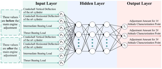 Back Propagation (BP) neural networks, which have the basic principle of calculating their output through forward propagation, then computing the error gradients using a back propagation algorithm, and finally updating the network weights according to the gradients, thereby continuously optimizing the model parameters, have strong feature extraction and learning capabilities and have been successfully applied in the alignment of propulsion systems [30]. Compared to the potential model Radial Basis Function (RBF) neural networks, which may be applicable to the alignment problem of propulsion systems, a BP neural network, through the back propagation algorithm, offers stronger adaptability and capability in handling global issues. The basic network structure consists of three hidden layers. The inputs are the crankshaft vertical deflection of the n# cylinder, the crankshaft horizontal deflection of the n# cylinder, the intermediate bearing load, and the thrust bearing load, both before and after the adjustment of the main engine. The outputs are three dimensions, representing the adjustment amounts of three attitude characterization points. This is shown in Figure 8.
