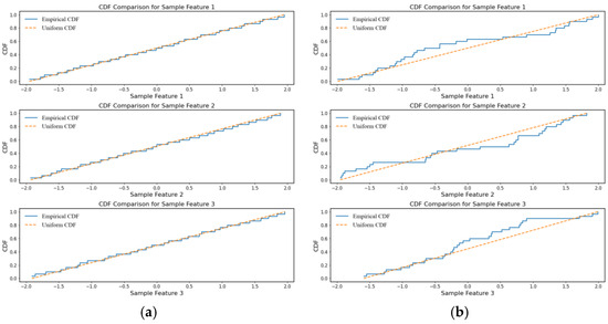 By comparing the ECDF and UCDF of the three sample features generated by the two sampling methods in Figure 9, in the figure, it is assumed that the sampling range of all three sample features is between −2 and 2, it can be observed that the LHS ensures that the samples are uniformly distributed across each dimension. Even with a limited sample size, LHS can more effectively estimate the characteristics of the parameter space. Compared to RS, LHS avoids issues such as incomplete sampling coverage and redundancy and it ensures better representativeness, especially when sampling in high-dimensional spaces [31]. Therefore, LHS is used for sampling in this research.